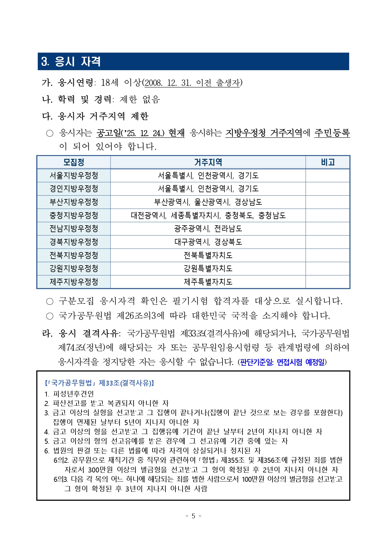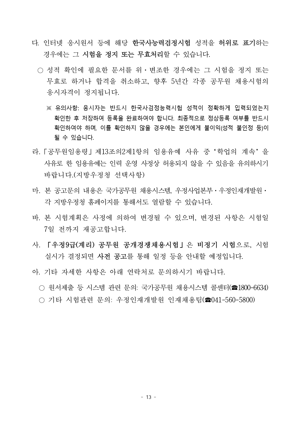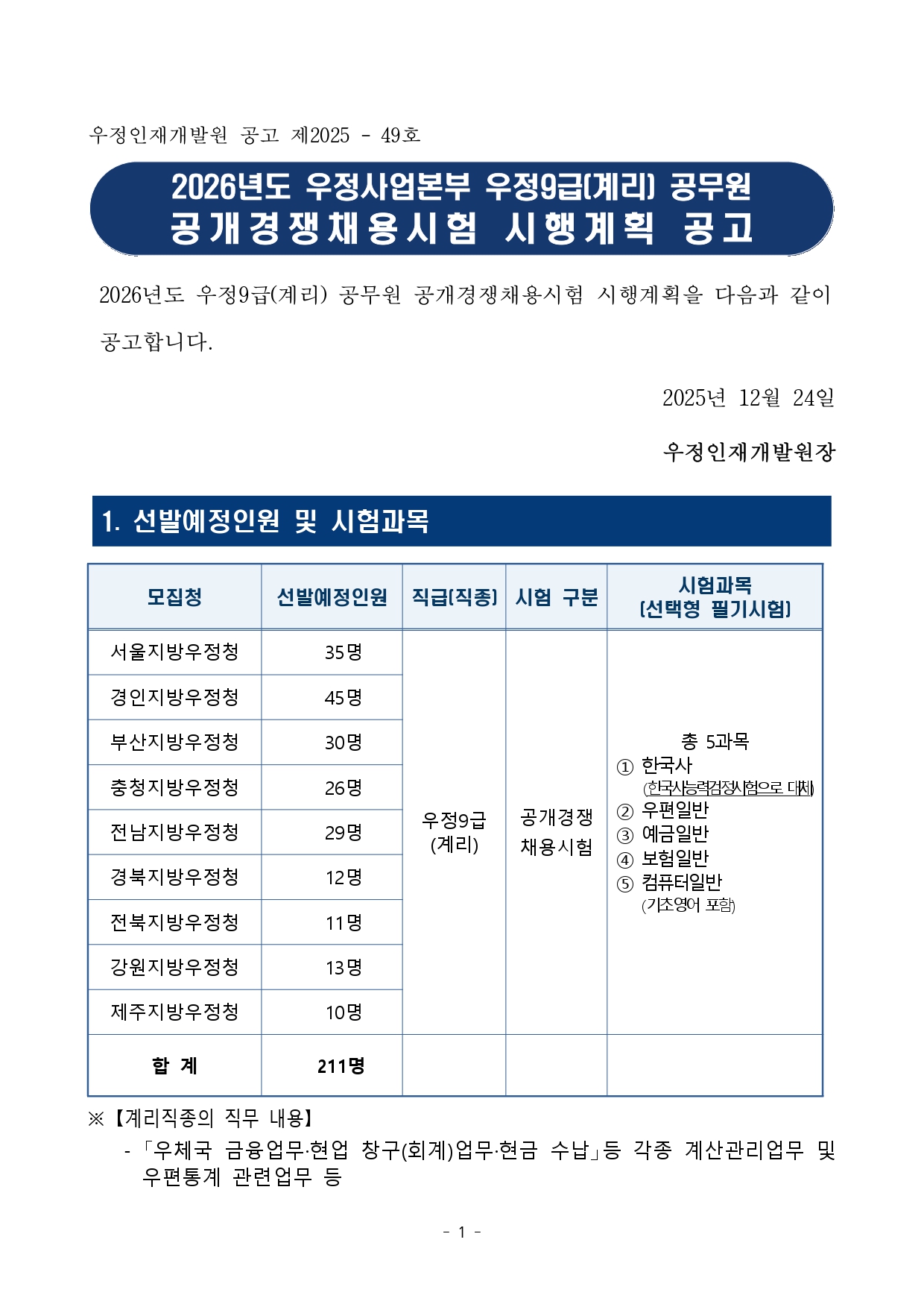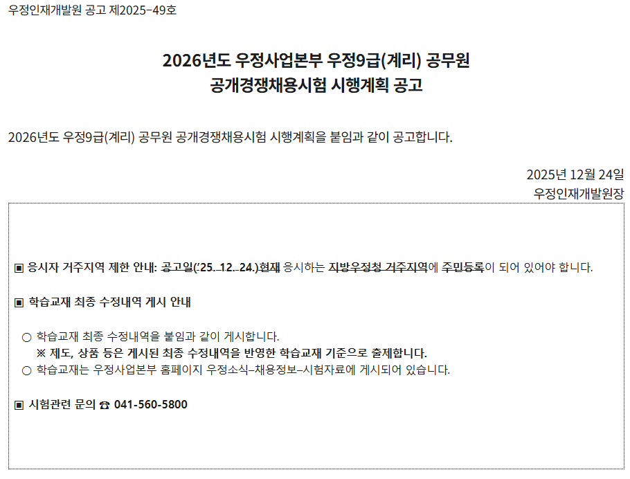 2026년도 우정사업본부 우정9급(계리) 공무원 공개경쟁채용시험 시행계획 공고