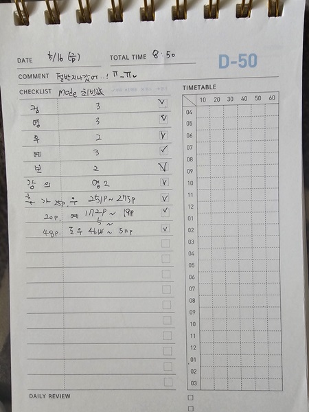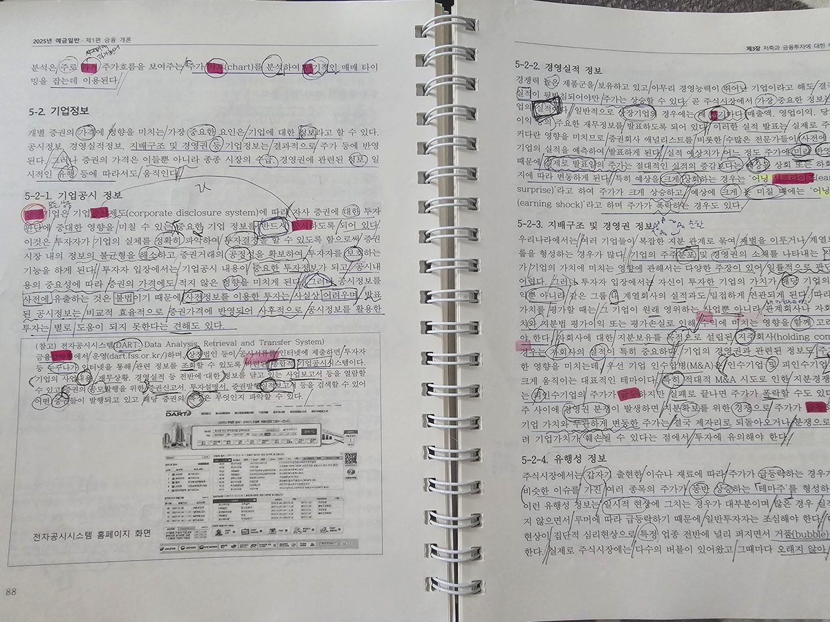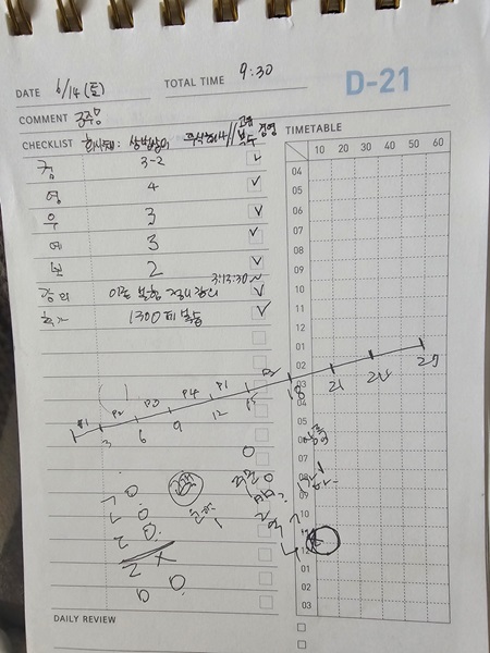 우편 80 예금 95 보험 95 컴퓨터일반+영어 60 모의고사 점수 1월 우편보험을 아예 안본 상태라 해당 과목은 패스, 예금95 컴영95 2월 340점 3월 370점 4월 370점 5월 380점 6월 각각 평균 90, 91.25, 93.75 계리직 준비기간 25년 1월 ~ 6월 / 1월 직장병행, 2~6월 전업 과목에 대한 사전 숙지 정도 우예보 : 없음, 컴퓨터일반 : 컴퓨터가 0과1로 이루어져있다는 것 정도, 영어 : 기초영어수준 12월 23일, 계리직에 대해 처음 알고 만 하루동안 고민 후 수강신청을 했습니다. 성탄절이 끼어있는 관계로 교재배송이 늦어져서 12월에는 제인선생님의 기초중의 기초를 수강했습니다. 1월에는 직장병행이라 틈틈이, 아침이나 점심시간, 일하다 시간 빌 때 공부했습니다. 저는 평일에 한 번 병원을 가야 했기 때문에 화요일을 쉬는 날로 잡고 시험 끝날 때 까지 수~월 6일 공부했습니다. 원칙1 일주일에 전과목 기본서 1회독씩 목표 원칙2 그 주에 나오는 강의는 그 주에 다 듣기 원칙3 쉬는 시간은 시간 단위가 아니라, 과목 끝나고 시간당 15분. ex) 우편복습이 2시간 걸리면 2시간 후에 30분 쉬었음 원칙4 쉬는 날과 쉬는 시간 때는 다른 생각 하지 않는다. 원칙5 원칙1을 지키되, 너무 힘들면 조금씩 미루자 무리하지 말 것. ex) 오늘 해야할 게 우편50 예금50 보험50 일때, 너무 힘들면 우편50 예금50만 함. 원칙6 순공량은 신경쓰지 말자 (보통 7시간 ~ 10시간) 원칙7 복습은 단순히 읽는게 아니라 내가 용납이 될 때까지 오전(9시30분~12시30분) : 컴일, 영어 기본서, 문제풀이 복습 * 저는 시험 끝날 때 까지 기본서를 전체 복습했습니다. 문제풀이의 경우 "내가 생각하기에 내가 다시 볼 필요가 있는 문제"만 복습했습니다. 점심시간 12시30분~14시 * 밥을 느긋하게 먹는 걸 좋아해서 길게 잡았습니다. 먹고 나서 가벼운 낮잠을 자거나 리프레쉬시간을 가졌습니다. 14시~19시 : 우예보 복습 * 무식하게 기본서전체페이지/6 해서 복습했습니다. 300페이지면 하루 50페이지를 꼭 봤습니다. 샤워 및 저녁시간 19시~20시30분 * 역시 그냥 길게 잡았습니다. 20시 30분 ~ 끝날 때까지(보통 자정쯤에 끝남) : 문제풀이 or 강의 ~2시나3시.. : 휴대폰보고 놀았습니다.. 장기간 공부해야하는만큼 노는시간이 아예없다면 금방 포기할거라생각했습니다. 웹툰을 주로봤는데.. 수험기간동안 어마어마하게 많은웹툰을 손댔는데 완결이 안난건 지금도 허덕이며 보고있습니다. 이런 시간이 필요없는분도있겠지만 저는 꼭 필요했던것같습니다.. 가장 후회했던 점은 조금 더 빨리 시작해서 24년 우보 강의를 미리 들어둘 걸, 못 들은 걸 후회했습니다. 우편 고민석 선생님 (암기팁특강만, 도끼 선생님) 예금 24년 고민석 선생님 25년 이종학 선생님 * 1월 말에 컴일, 영어강의를 따라잡았을 때 1주일 정도 시간이 비었습니다. 일주일동안 24년 고민석 선생님 예금 완강했는데 가장 잘 한 결정입니다.(설날이 끼어있어서가능했음) 보험 김종희 선생님 컴일 유수 선생님 영어 제인 선생님 저는 개인적으로 고민석 선생님이 가장 잘 맞았습니다. 세세하게 단어 하나하나 알려주는 게 저랑 잘 맞았어요. 영어의 경우 문제집 만드느라 정말 힘드셨겠다 생각들었습니다. 기출문제가 없다보니 하나하나 만드셨어요.. 또 제가 영어 기본이 거의 없는데 이상하게 짧든 길든 독해에 강했습니다. 25년에 독해가 많이 나와서 살아남은 것 같습니다. (대충 제 생각대로 독해하고 이거겠지 찍으면 이상하게 맞더라구요.. 해설보면 맞는게 신기할 정도로 다르게 해석했는데..) 봉투모의고사가 정말 많이 도움되었습니다. 미리 마킹해보는게 정말 많이 도움돼요 100일 플래너 당첨됐는데 정말 알차게 썼습니다. 100일부터 마지막날까지 너무너무 좋았어요. 계리직에 맞춰서 디데이가 설정되어있어서 굿이었습니다. ![]() ![]() 공시생사이트에서 빈칸생성(빨간형광펜, 초록시트지) 사서 공부했는 데 정말 많이 도움되었습니다.. 처음에는 몇몇단어만 칠하다가 회독하면 할수록 빈칸을 늘려갔습니다. |