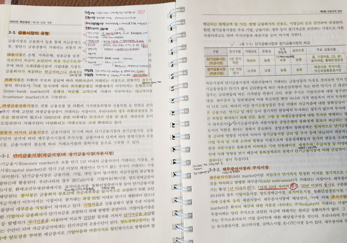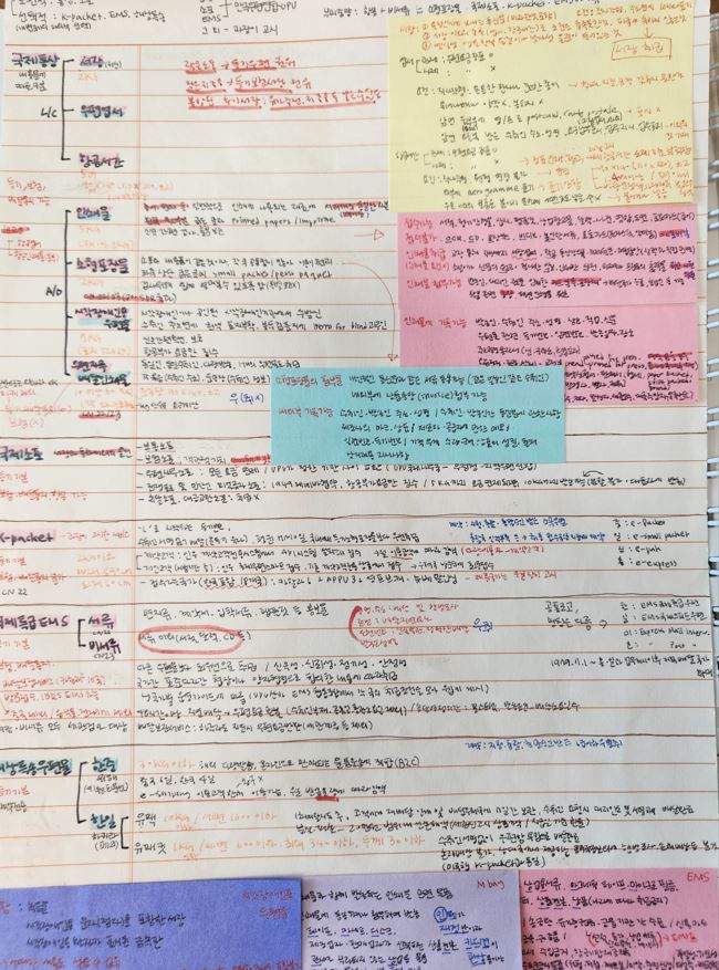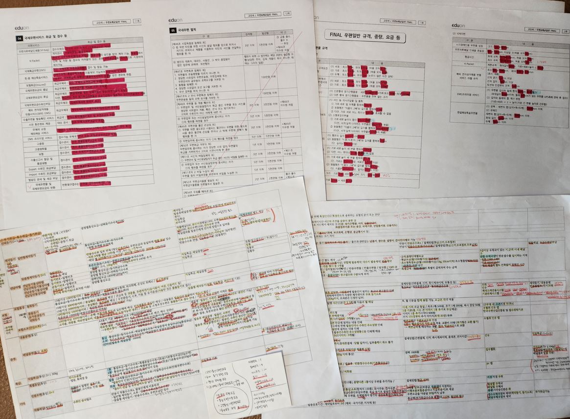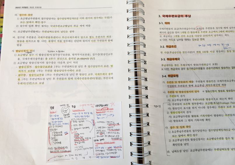 9월~11월 중순 <컴일 시작 및 이해 위주> 아직 초반이고 공고가 나지 않았을때라 주말에도 쉬고 적당히 공부했던 것 같습니다. 해외여행도 갔어서 중간에 2주이상 공부를 전혀 안한 적도 있었습니다. 이 시기에는 컴일만 하면서 기틀을 마련했습니다 이때 다진 실력으로 컴일은 모의고사에서 늘 안정권이었고 시험에서도 고득점이 나올 수 있었던 것 같습니다. 다만 영어는 기본 실력이 있다고 생각하고 자만해서 소홀히 했더니 실제시험에서 완전 망해버려서 후회하고 있습니다. 합격을 위해서는 꼭 초반에 영단어, 숙어도 열심히 해서 잡고 가셔야 합니다… -컴 : 2024 기초이론(소요기간 11일) - 기본서 1회독(9일) - 기본서 2회독&포스트잇에 요약&핸드북풀기(10일) - 2024 심화강의(9일) - 기본서 3회독(9일) - 2024라이브특강(7일) -영 : 제인쌤이 올려주신 숙어 및 교육부지정필수영단거 한번 읽어봄 (이때 열심히 외웠어야 함…..ㅠㅠ) 11월 중순~2월 <우예보 시작 및 이해 위주> 11월 1일에 공고가 나서 11월 중순부터는 영어와 우예보(예보 상품 제외) 공부를 시작했습니다 예금이 이해할 내용이 많지만 한 번 이해하면 휘발성이 적다해서 제일 먼저 시작했고 우편이 단순암기라 휘발성이 높다해서 마지막으로 시작했습니다 주말에 하루라도 쉬면 흐름이 끊겨 다음날 공부하기가 어려웠기 때문에 주말에 한두시간이라도 하려고 했습니다 - 컴(매일3시간씩) : 단권화(7일) - 타직렬 기출 1회독(7일) - 타직렬 기출 2회독(9일) - 타직렬 기출 3회독(1일) - 타직렬 기출 단권화(12일) - 단권화한것 1회독(6일) - 계리직 기출 1회독(8일) - 영(매일1시간씩) : 영어 바이블(하루 1~2unit씩 풀면서 모르는 단어 형광펜, 복습, 문법만 인강듣고 정리) - 계리직학습지(매일 3unit씩 풀기) - 우예보(하루에 한 과목씩만, 남는시간동안 함) : 이쌤 예금 기초특강(6일) - 이쌤 예금 일반이론(7일) - 예금 기본서 1회독(5일) - 예금 기본서 2회독 & 김쌤 보험 기초특강(5일) - 김쌤 보험 기본이론 & 고쌤 우편 기초이론(5일) - 보험 기본서 1회독(5일) - 보험 기본서 2회독 & 고쌤 우편 기초이론(3일) - 고쌤 우편 기본이론(6일) - 우편 기본서 1회독(5일) - 우편 기본서 2회독(4일) - 예금 기본서 3회독(7일) - 보험 기본서 3회독(4일) - 우편 기본서 3회독(6일) - 예금 기본서 4회독(6일) - 보험 기본서 4회독(3일) - 우편 기본서 4회독(5일) - 2025 우예보 개정특강만 들음 - 예금 기본서 5회독(7일) - 보험 기본서 4회독(5일) - 우편 기본서 5회독(7일) 3월~4월 <컴일 유지 및 끝없는 우예보 정리..정리....정리....... & 상품시작 & 문풀시작> 영어는 늘 꾸준히 1시간 정도씩 했고 컴일은 계속 안정권이었기 때문에 휘발을 막는 정도로만 하려 했습니다 하지만 컴영하고 남는시간에 우예보를 했더니 우예보 진도가 잘 안나갔던 것 같고 지금보니 컴영1 : 우예보1 비율로 공부했던 것 같네요 D-100으로 공부시간도 늘리고 열심히 해야하는 시기인데 허리가 아파져서 공부시간도 오히려 줄었고, 본격적인 암기를 시작하기 전 기본서와 상품을 정리하는 단계였기 때문에 스스로 정체기라고 느끼고 공부방법에 혼란을 느끼던 시기였습니다(당시에는 왜 우예보 점수가 정체기였나 싶었는데 지금 수기쓰며보니 그냥 우예보 공부를 별로 안했었군여.. 우예보 정리는 아래 사진처럼 해서 방대한 기본서의 양을 적게 보이게 했습니다) 하필 서울청 TO 도 적게 발표났어서 ‘이번 시험은 안될수도 있겠다 하지만 이렇게 공부 했을 때 내가 어느 수준까지 갈 수 있는지 봐야 내년에 시험 대비를 더 잘 할 수 있으니 일단 최선을 다해보자’ 라는 마인드로 꾸준히 공부하려 했습니다 이 때 이쌤 예금 암기 스터디에 들어가게 되어 예금만 먼저 암기를 시작했는데 도움이 많이 되었고, 운동하러 이동하는 시간에 우읽남 예읽남을 들었는데 자투리 시간을 유용하게 쓰는 것 같아 스스로 만족감을 느꼈습니다ㅋㅋ OX는 풀어보니 도움이 많이 되어서 꾸준히 풀려고 했으나 시간이 부족하기도 했고 자투리 시간에 풀다가 멈추고 나중에 다시 시작하려하면 리셋되어 있거나 시간초과로 끝나있어서 앞에 한두단원 정도 풀어보다가 관뒀습니다 - 컴 : 계리직 기출 2회독(11일) - 계리직 기출 단권화(5일) - 2025 심화특강(매일3강씩) - 2025 기출해설강의(매일 1~2강씩) - 컴일 기출1권 복습(5일) - 2025 기출 2권 해설강의(매일 1~2강씩) - 1300제 체크해주신 문제들 품 - 영 : 계리직학습지(매일 3unit씩 풀기) - 예상문제집(4~5쪽씩) -우예보 : 우예보 2024핵심체크 문풀(8일) - 예금 상품 및 감액 정리 - 우편물류 추가부분 회독 - 2025 김쌤 보험강의 상품부분만 듣고 정리 - 우예보 기본서 6회독(16일) - 2025 김쌤 보험 심화강의 - 예금 북적북적 문풀 1회독 & 보험 상품 정리 - 김쌤 보험 문제집 1회독 - 우편 2025 핵심체크 1회독 - 보험 상품 스터디 시작(1달 진행, 매일 4문제 풀고 암기) - 우편 기본서 정리(아래 사진 참고) - 보험 고석용쌤 문제집 1, 2회독 - 예금 예상문제집 1, 2회독 - 우편 예상문제집 1,2회독 - 보험 김쌤 문제집2회독&보험 고쌤 문제집3회독 6월 <우예보 본격 암기 시작> 그동안은 정독을 하며 이해하고 정리하며 눈에 발라 익숙해지게만 했지 암기를 따로