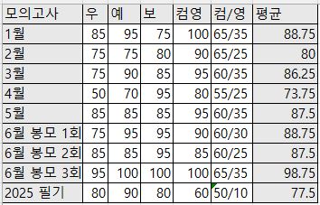 계기 및 시작 2024.07.20 : 이 날이 2024년 계리직 필기 시험일이었는데, 진로를 고민하느라 하루종일 인터넷 서핑을 하다 운좋게 계리직 시험 후기를 보게 되었습니다. 컴영이 제일 어려운 과목이라고들 하던데 풀어보니 점수가 나쁘지 않아서 관심이 생겼습니다. 그러나 공무원 시험은 장기간 공부를 해야 하는데, 평생을 벼락치기로 공부하며 살아온 제게 그런 끈기와 적절한 공부방법이 있을지 의심이 되었습니다. 마침 3주뒤 한능검 시험이 있어서 시험해보고 결정을 하자 싶어 부랴부랴 추가접수를 했고 한능검 공부를 바로 시작했습니다. 2024.08.10 : 한능검 합격 // 계리직 시험의 가능성을 보고자 시작한거라 60점만 넘긴다는 생각보다 그냥 다 외운다는 생각으로 공부했고 유튜브와 어플 ‘한국사 오답노트 프로 버전-4900원’ 만 이용했습니다. 시험 보면서 모르는 문제는 없었으나 고려 왕의 순서를 애초에 잘못 필기해 외워서 아쉽게 98점이 나왔습니다. 계리직은 문제 유형이 틀림그림 찾기라고 들었어서 우예보 단권화 노트는 따로 만들지 말아야겠다고 결심하는 계기가 되었습니다 ㅋㅋ 오픈카톡방에서 한능검을 어려워하시는 분들을 많이 봐서 공부방법 참고하시라고 밑에 자세히 써두겠습니다. 2025.09.02 : 비해피패스 결제 및 계리직 공부 시작 ------------------------------------------------------------------------------------------------------------------------------------------------------- 수험생활 공부하면서 가장 방해됐던 부분이 허리와 목 통증이었습니다. 기사자격증 공부할 때 등허리가 힘들었던 경험이 있었기 때문에 이번에는 운동을 최대한 병행하려 했지만, 공부시간 확보를 위해 시험 1~2달전부터 운동을 중단하고 앉아만 있으니까 급격히 안좋아졌습니다. 급기야 시험 10일전에는 경추성 두통으로 머리가 울리고 몸살걸린것처럼 열감이 와서 공부에 집중하기가 어려웠습니다. 뇌수막염으로 입원했을 때만큼 아팠어서 이때는 정말 시험을 포기해야 하나 싶었고 건강관리가 가장 중요하다는 것을 깨달았습니다. 순공시간이 안나오더라도 조급해하지 마시고 꼭 시험 직전까지 운동이나 스트레칭을 꾸준히 하시길 권해드립니다 ㅠㅠ 그리고 잠도 충분히 주무시면서 공부하셔야 합니다.. 저는 잠을 너무 줄였더니 체력이 많이 떨어져서 막판에는 샤워할 때 심장이 쿵쿵뛰고 ‘이러다 과로사로 죽는거 아닌가 계리직 붙어도 건강검진에서 짤리는거 아닌가’ 싶을정도로 힘들었습니다 마지막 1달은 매일 글루콤(효과 애매한 것 같음)과 박카스를 먹으면서 반 좀비상태로 버텼던 것 같습니다. 10개월 공부하는 내내 생활 습관 고쳐야지 다짐만 하고 결국 못고쳐서 시험 전날에도 3시간 자고 갔고..꼭 바른 습관이 합격으로 이어지는 건 아니고 저처럼 생활습관 나쁜 새벽파도 합격할 수 있으니 걱정말라는 말씀을 드리고 싶지만.. 그래도 여러분들은 꼭 건강을 위해 바른 생활을 하시기 바랍니다… 저는 아직까지도 체력 회복을 못하고 골골대고 있습니다. 공시는 장기 레이스이기 때문에 스트레스를 풀기 위해 취미생활도 어느정도 하는 것이 지치지 않고 오래 공부할 수 있는 방법인것 같습니다 저는 드라마 보는 걸 좋아해서 폭삭속았수다 미지의세계 등등 밥먹으면서 시험 직전까지도 다봤었습니다…다만 중독의 여지가 있는 취미 생활은 자제하시는 걸 추천 드립니다 저는 제 자신을 잘 알기 때문에 웬만하면 완결이 난 드라마는 보지 않으려 했습니다 너무 재밌으면 하루종일 쉬지 않고 끝까지 보느라 하루이틀 날리기 때문이지여.. ㅎㅎ 그럼 공부를 못하는 건 둘째치고 제자신이 한심하고 후회되고 그랬던 것 같습니다. 그래도 긍정적으로 생각해보면.. 그렇게 하루 날리고 나면 다음날부터는 정신차리고 맘잡고 공부가 잘됐던 것 같긴 합니다... 8:55 : 기상 9:00-18:00 : 일과 공부 병행 (코로나 이후 재택근무 시행중이라 짬날때 몰래 공부하기 좋은 환경이었습니다. 그러나 컴퓨터 앞을 벗어날 수 없고 책 앞에 컴퓨터가 계속 켜져있는 상태라 자꾸 딴짓을 하게 되어 맘잡고 공부하기가 너무 어려웠습니다 오전에는 주로 일과 인터넷쇼핑을 하느라 1시간정도, 오후에는 2~3시간정도 공부한 것 같고 주로 컴영을 했습니다 시간이 되면 우예보도 조금 했습니다.. ) 18:00-20:20 : 외출 준비 및 운동(수영, 필라테스) 20:20-새벽 2~4:30 : 저녁먹고 쉬고 우예보 공부하고.. (벼락치기형 인간이라 매일 저녁에 그날의 분량을 벼락치기하느라 늦게 잤습니다..ㅜㅜ) 순공부시간 공시생은 하루에 순공 8시간 이상 찍어야 합격한다는데 저는 그렇게 시간이 안나오는데다 열품타에서도 늘 중위권이라 제가 잘 하고 있는게 맞나 싶었습니다. 매일 8시간 이상인분들은 어떻게 저게 가능하지 다 뻥일꺼야… 라고 정신승리하면서 멘탈을 잡았던 것 같네요ㅋㅋㅋㅋ 다행히 제가 합격한 걸 보면.. 물론 운도 좋았지만 매일 꾸준히 자기만의 페이스대로 집중해서 하는게 가장 중요한 것 같습니다 인강포함 11월 168시간, 12월 200시간, 1월 200시간, 2월 184시간, 3월 220시간, 4월 192시간, 5월 242시간, 6월 270시간, 7월 55시간 모의고사 및 시험 성적 1~5월 모의고사는 늘 100등 커트
