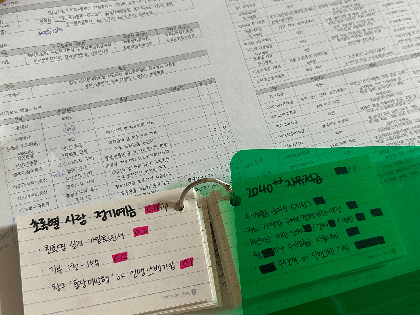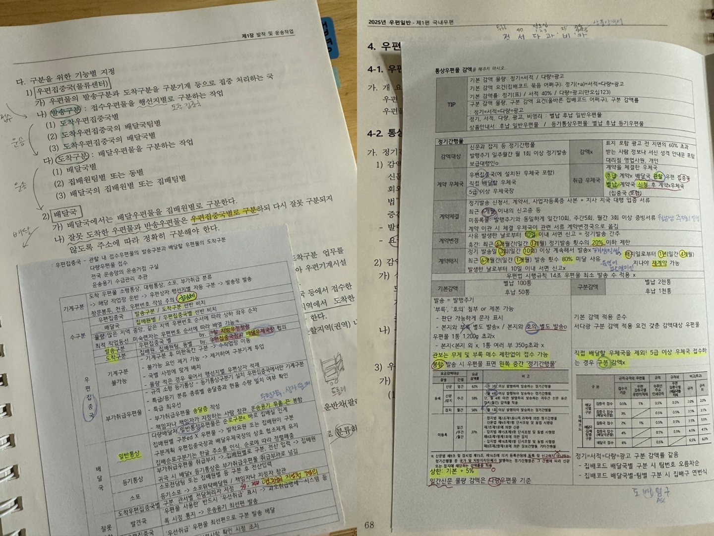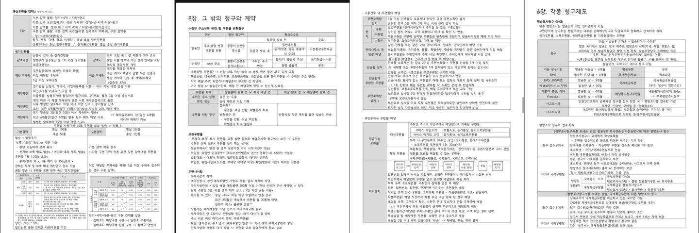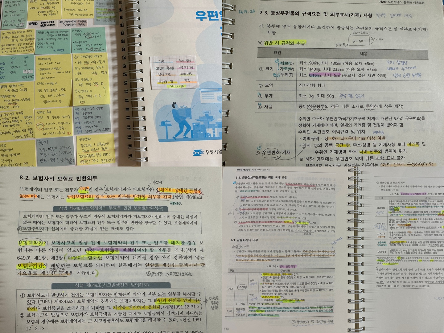 부산청 재시생입니다. 제대로 준비해서 꼭 초시의 서운함을 털어내겠다 다짐했지만 여러모로 아쉬움이 많이 남는 시험이었습니다. 다행히도 이번에는 필기합격의 문턱을 넘을 수 있게 되어 기쁩니다. 저는 30대 수험생이며 직장을 다니면서 수강권은 미리 끊어놨었습니다. 다만 한능검 + 연말 마감 +퇴사 등으로 선행 학습은 거의 하지 못했고, 24년 1월 퇴사 후 본격적으로 공부했습니다. 전업 공시생이 된 후로는 늦은 만큼 쉴 수 없다 생각하여 평일 10~12시간, 주말 8~10시간 공부했습니다. 그 결과 초시치곤 좋은 점수를 받았지만 합격의 문턱을 넘지는 못했습니다. 최대 2년의 수험기간을 잡았기 때문에 주저 없이 재시 도전을 했고, 조금 슬럼프 기간이 있었지만 다시 하루 10시간씩 공부했습니다. 귀찮아서 합격수기를 대충 쓸까 고민도 했지만ㅋㅋ… 저는 재시 준비가 너무나도 막막했기 때문에 누군가에게 도움이 되길 바리며 조금 길게 쓰겠습니다! (+이벤트^.^) [수험기간] - 초시: 2024. 1월 ~ 7월 (95, 95, 90, 65(영어7) = 86.25 (부산청 컷 87.5 필탈)) - 재시: 2024. 10월 ~ 7월 (95, 90, 80, 50(영어4) = 78.75 (부산청 컷 73.75) - 컴활 2급(1급 필기, 2급 실기), 토익스피킹 취업용 마지노선 수준 - 한능검 2급 23년 10월 직장병행 취득 ’작년에 아쉽게 떨어졌으니 올해는 그냥 합격이네~‘ 소리 듣기 싫어서 더 열심히 했습니다. 오전 영어, 컴일 / 오후 우예보 2~3과목을 공부했습니다. [우편] -초시: 고민석T 기본강의, 기본서 11회독, 예상문제집 3회독, 핵심체크 2회독, 타사 우정우 우편실록 2회독, 하종화 OX 1회독, 개인 정리본 -재시 : 도끼T 기본강의, 고T 개정강의, 기본서 10회독, 개인 정리본 5회독, 예상문제집 4회독, 핵심체크 3회독, 도끼T동형 3회독 저는 고민석 선생님이 매우 잘 맞았습니다. 기본서를 읽다가 ‘왜?’ 라는 의문이 생겨 다시 강의를 들으면 대부분 먼저 답을 말씀해주셨습니다. 오래 강의하신 만큼 수험생이 어느 부분을 궁금해하는지 아시는 것 같습니다. 다만 저 자신이 아는 만큼 이해하고 흡수 할 수 있었던 것 같습니다 ㅋㅋ 재시생들은 2배속으로 기본강의를 한번 더 듣는 걸 추천합니다. 여기까지도 말씀해 주셨구나.. 깨달을 수 있습니다. 25년 개정 발표 후 도끼쌤 강의를 들었습니다. 반신반의했지만 어느 순간 901삼겹살을 외우고 있는 저를 보며 삼겹살이라도 얻으면 이득이란 생각으로 완강했습니다. 결국은 시험 당일 암기팁들이 답을 흔들고 있는 것을 경험했습니다. 정말 감사합니다 (하오하오ㅠㅠ) 우편은 특히나 개인 정리본이 도움이 많이 되었습니다. 개요별로 묶어서 표로 정리하고, 나중엔 필요한 부분만 오려 기본서에 붙였고, 시험 전 날에는 그 부분만 읽었습니다. 특히나 감액과 우편물류 부분은 기본서보단 제 정리본에 더 의지했습니다. 정말 아끼고 공들인 파일이라 유상통 카페에 공유할 예정입니다. 많이 활용해 주시면 너무 뿌듯할 거 같습니다ㅠㅠ (공유 완료) ![]() ![]() [예금] -초시: 고민석T 기본강의, 기본서 7회독, 예상문제집 3회독, 핵심체크 2회독, 북적북적 2회독, 타사 우정우 예금실록 2회독 -재시: 고민석T 기본강의, 기본서 10회독, 예상문제집 3회독, 핵심체크 3회독, 24년 북적북적 2회독 역시 의심 없이 고민석 선생님 강의를 들었습니다. 선생님 교안을 아이패드에 다운받아 강의를 듣고, 혼자 복습하면서 필기를 기본서에 옮기는 것으로 1회독을 완료했습니다. 이후 기본서>예상문제집>기본서>핵심체크>기본서>단원별 문제집>단원별 기본서 등 열심히 반복만 했습니다. 기출 경향을 보면 상품 비중이 매우 크기 때문에 상품은 절대 버려서는 안되는 부분입니다. 25년 우대이율 개정에 헉 소리가 났지만 고민석 선생님께서 제시해 주신 방향대로 공부했습니다. 기준점을 잡아 상품정리를 다시 하고, 글이 머리에 들어오지 않는 날에는 선생님 강의를 틀어놓고 멍 때렸습니다. 재예치, 온라인 가입, 신규 가입 등 보험 과목에서 배운 공통점으로 묶는 접근법을 활용하기도 했습니다. 종합과세, 재무비율, 법령도 버리지 않았습니다. 장황하게 썼지만 상속 문제를 틀려 아쉽습니다. ![]() [보험] -초시: 고민석T 기본강의, 김종희T 모든 강의, 기본서 6회독, 김T합격문제집 4회독, 예상문제집 2회독, 핵심체크 3회독 -재시: 김종희T 기본강의, 심화강의, 기본서 8회독, 합격문제집 4회독, 24년 예상문제집 1회독, 24년 핵심체크 1회독, 그 외 김종희 선생님이 주시는 모든 자료 빛종희입니다. 제발 시키는 것만 하세요. 시키는 것만 하기에도 벅찹니다. 저는 하도 삽질을 많이 해서 라이브 강의 후 꿈에 삽이 쫓아오는 악몽도 꿨습니다. ㅋㅋㅋ 다만 잘 차려주신 밥상에 숟가락질을 많이 못한 것 같습니다. 우예보 세 과목 중에 점수가 제일 낮아 면목없습니다. 죄송합니다ㅠㅠ 김종희 선생님 꽃은 상품 라이브 강의입니다. 상품 라이브 강의가 끝나고 그 많고 많은 상품 정리를 A4 3장에 끝냈습니다. 이 외에 나오는 것은 남들도 못 맞힌다 생각하고 이것만 달달 외웠습니다. ![]() [컴퓨터 일반] -초시: 유수T 기초강의, 심화강의, 1300제 2회독, 기출문제집 2회독, 라이브 노트정리 -재시: 유수T 24 심화강의, 25 기초, 심화 