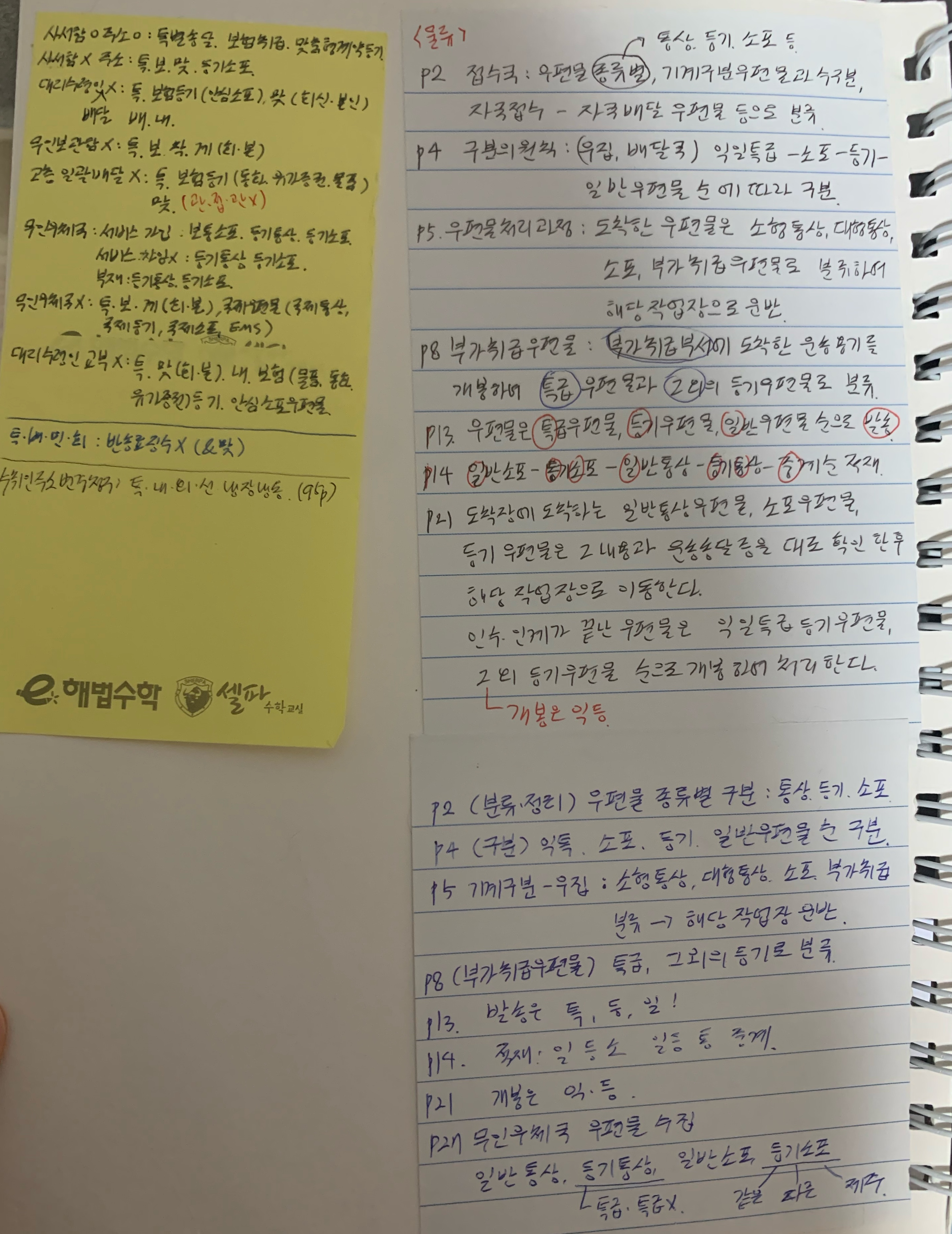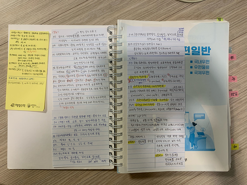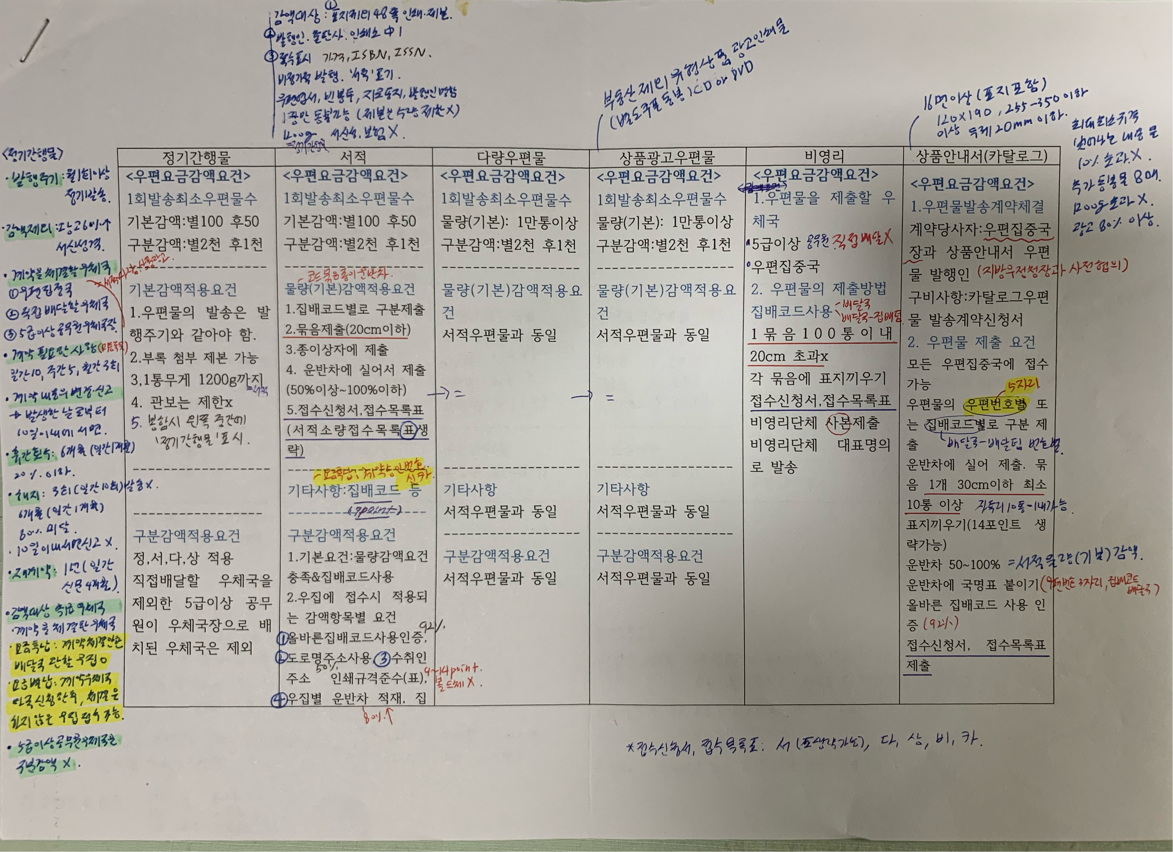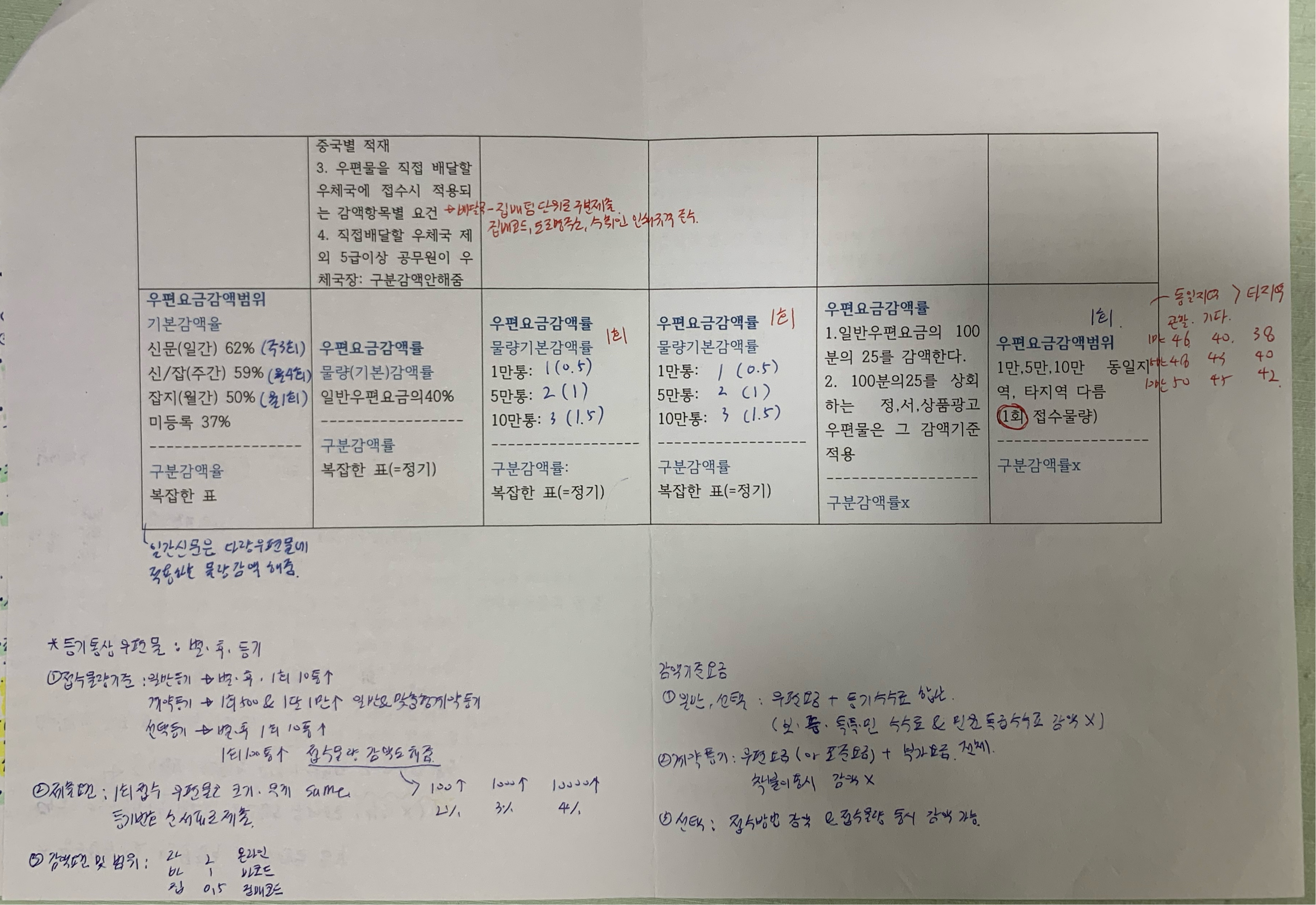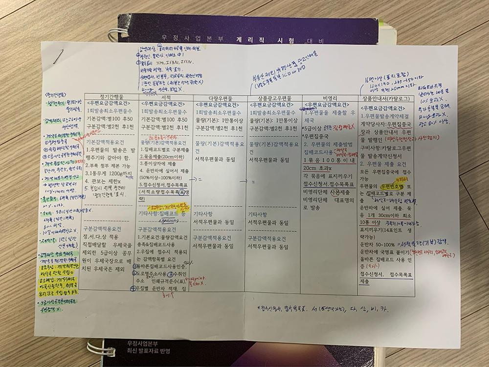 <토일> 3월까지는 토요일은 놀고 일요일은 공부했습니다. 4월부터는 약속 잡지 않고 토일 모두 12시~23시까지 공부했습니다. *우편: 작년에 우편은 만점받아서 자신이 있었는데 다시 책을 보니 통상우편 규격도 기억이 나지 않을 정도로 머릿속이 초기화 되어 있더라구요 ㅜㅜ 그만큼 휘발성이 강한 과목이란 생각이 들었고 외우려면 자주 보는 수밖에 없었습니다. 합격수기를 찾아보니 20회독 이상 하신분도 계시고 책을 읽다보면 회독 시간이 짧아진다고 하던데 저에겐 그 방법이 맞지 않았습니다. 저는 책을 처음부터 끝까지 아주 꼼꼼히 보는 편이었고 그래서 회독을 많이 하진 못했어요. 대략 5~6번 하지 않았나 생각합니다. 기본서 두 번 돌리고 고민석쌤의 문제집과 핵첵을 한번씩 풀었고 시험보기 직전에 틀린 문제만 다시 보았습니다. 저는 작년에 공부를 했어서 고쌤의 기본강의를 먼저 수강했는데 처음 하시는 분들은 책을 최소 한번은 보시고 강의를 들으시면 강의 효과가 훨~~씬 올라갈 것이라 생각합니다. 고쌤은 정말 꼼꼼히 알려주시기 때문에 책을 읽고 보면 이해도가 높아져요. 우예보는 어차피 통째로 책을 외워야 하기 때문에 단권화는 의미가 없다고 생각했고 감액처럼 정말 헷갈리는 부분만 정리했습니다.
