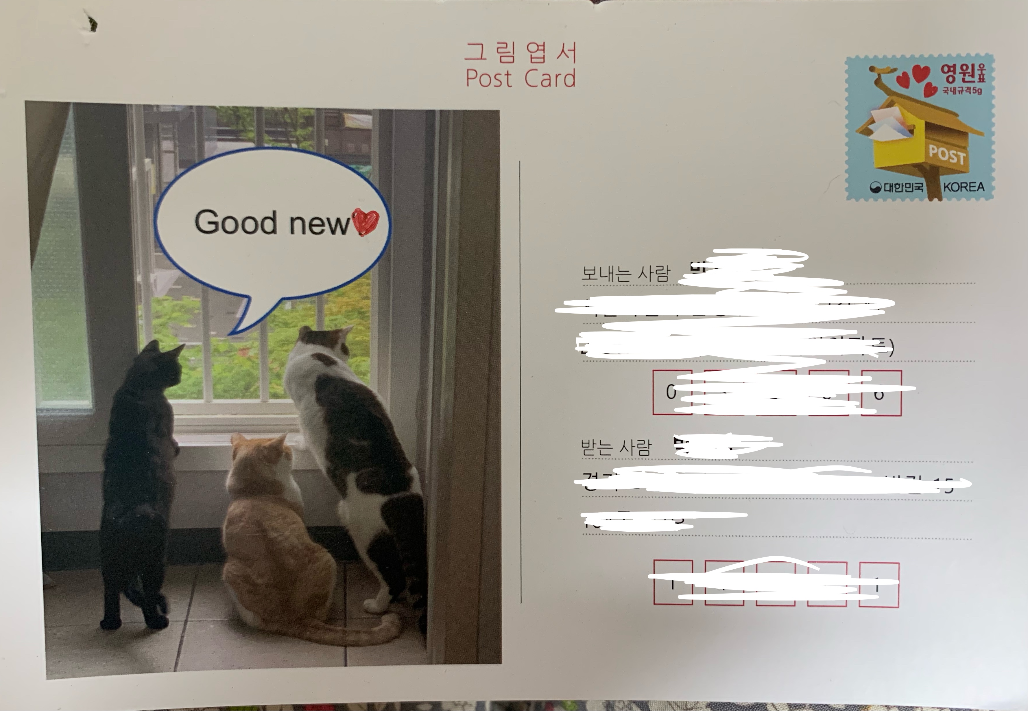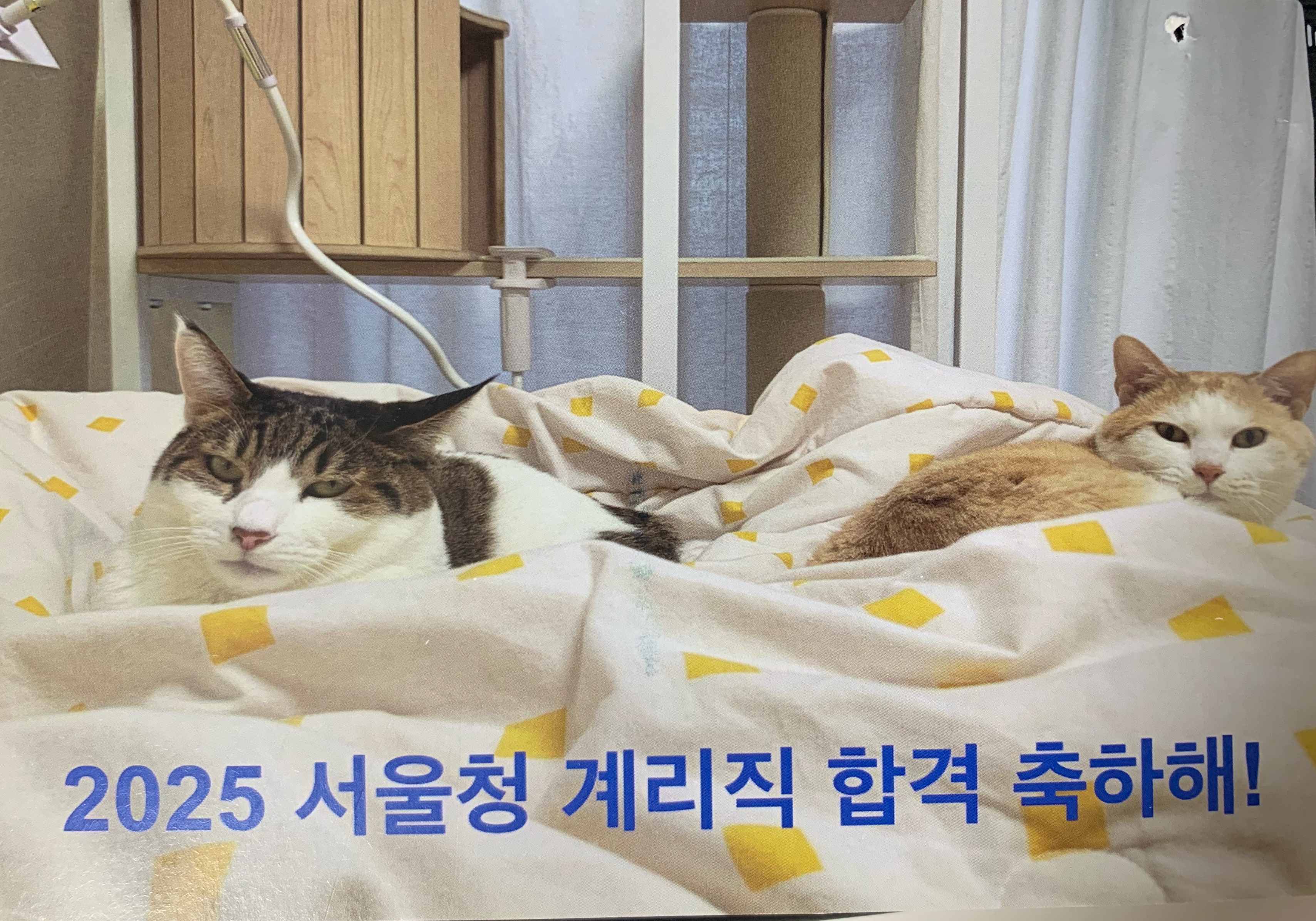 ∙ 힘들었던 순간과 극복 방법은? 저는 필기보다 면접준비가 너무 힘들었습니다 ㅠㅠ 제가 커트라인이다보니 무조건 우수를 받아야 한다는 압박감이 힘들었어요..그때마다 할 수 있는건 최선을 다해서 하고 나머지는 신께 맡긴다고 생각하고 그냥 닥치는 대로 했던거 같아요. 그리고 자기전에 내가 우체국에서 일하는 모습도 상상하고, 28명밖에 뽑지 않는데 내가 문닫고 들어가면 얼마나 짜릿할까 등등 긍정적인 생각을 하며 이겨냈습니다. 그리고 맛있는 커피와 디저트 먹는 것이 낙이어서 주말에는 혼자 집앞 스벅가서 공부하면서 힐링했던 것도 도움이 되었던 것 같아요. 또 제 나름의 합격부적(?)을 만들었습니다. 면접준비하면서 우체국 어플로 모바일엽서를 만들어 저에게 보냈어요. 모델은 저희집 고양이들입니다. ^^ 벽에 붙여놓고 행복하게 바라보면서 힘든 시간을 견뎌냈던 것 같습니다.