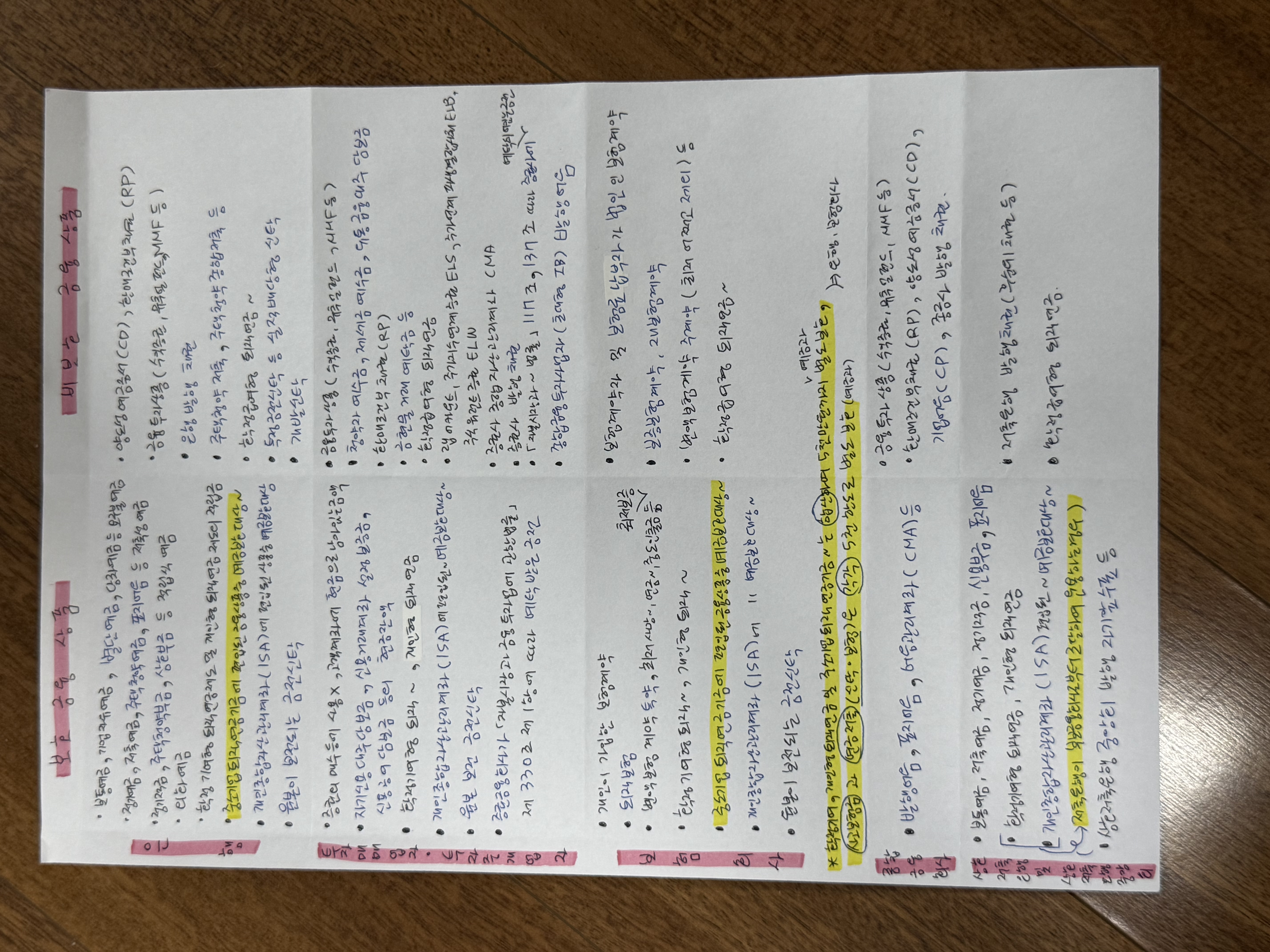결론 : 유수쌤이 시키는대로 + 단권화노트 입니다 영어는 공부를 안해서 드릴말씀이없네유.. ㅠㅠ 실제 시험장에서 딱 첫문제만 풀었고 (운좋게 맞았어요) 그 뒤부터는 한줄로 밀었어요..ㅎㅎㅎ 컴퓨터일반 과목을 다 마킹해두고 가장 안나온 정답번호로 밀었어요.. ㅋㅋㅋㅋ 무조건은 아니지만.. 1번부터 4번까지 비슷한 비율로 정답을 만든다는 소리를 들어서..ㅎㅎ;;;; 아무튼 시간이 충분하시다면 꼭 영어공부 하셔요..!! 시험이 다가올수록 영어공부를 안한것에 대한 불안감이 커집니당..ㅎ • 예금 80점 예금은 이종학 선생님 강의를 들었어요! 예금과목은 배속으로 듣지않고 원래속도로 들었어요. 강의를 보면서 선생님이 하시는 말씀을 다 새겨들으려..(?) 노력했어요 ㅎ 강의를 들은땐 그렇구나~ 하는데.. 또 막상 책을보면 이게 무슨소리지..? 하게 되는 매직 ㅠ 이번시험땐 예금과목에 시간을 제일 많이 쏟았던거같아요! 이종학 선생님 강의로 이론을 다지면서 뭔가 이해가 잘 안되는 부분은 그 부분만 고민석 선생님 강의를 찾아보기도 했어요. 오늘 1강~3강을 강의를 들으면 다음날 4강~6강 강의듣기 + 1강~3강에 해당하는 기본서 내용을 정독 했어요. 처음 공부할땐 기본서 보는거 자체가 너무 힘들어요.. ㅠㅠ 보면서 모르는 단어나 내용이 있으면 네이버 사전, 블로그, 유튜브, 챗gpt 에 검색해가면서 어떻게든 이해하려고 노력했고 기본서에 샤프로 추가 설명내용을 싹 다 적었어요. 이렇게 하다보니 당연히 속도는 좀 느렸지만.. 탄탄하게 공부할수있었어요..!! 월요일 ~ 토요일까지 이런식으로 공부하면 일요일에는 월~토에 공부했던 내용을 한번 더 복습했습니다. 속도가 오래걸려도 기본서 회독을 정말정말 열심히했어요. 예금뿐만아니라 우예보 모두 기본서 회독은 중요하답니다!