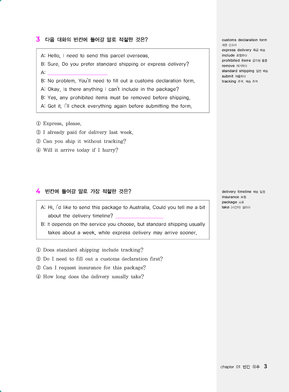 특수표현이 익숙해지면 그것을 회화에 넣어 연습하고 (예: “제 택배를 조회하고 싶습니다.”),