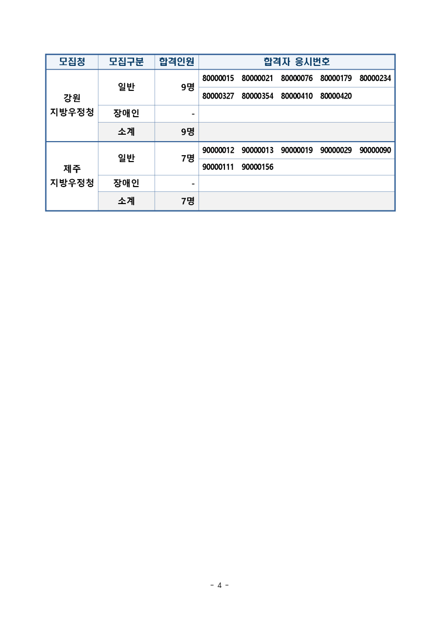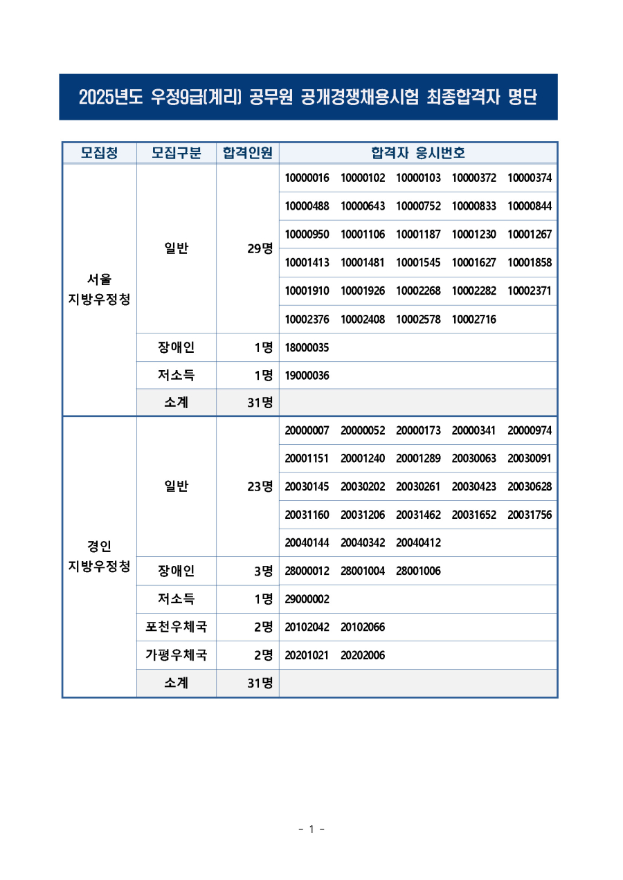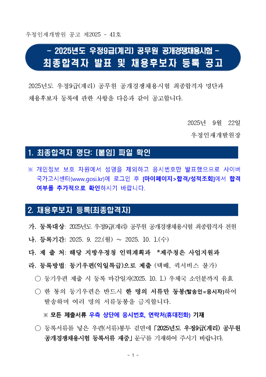 공지사항 HOME 학습지원센터 공지사항 공지사항 2025년도 우정9급(계리) 공무원 공개경쟁채용 최종합격자 발표 및 채용후보자 등록 공고 DATE 2025-09-22 NAME 조회수 964 2025_합격자발표_및_등록관련안내.zip 목록보기