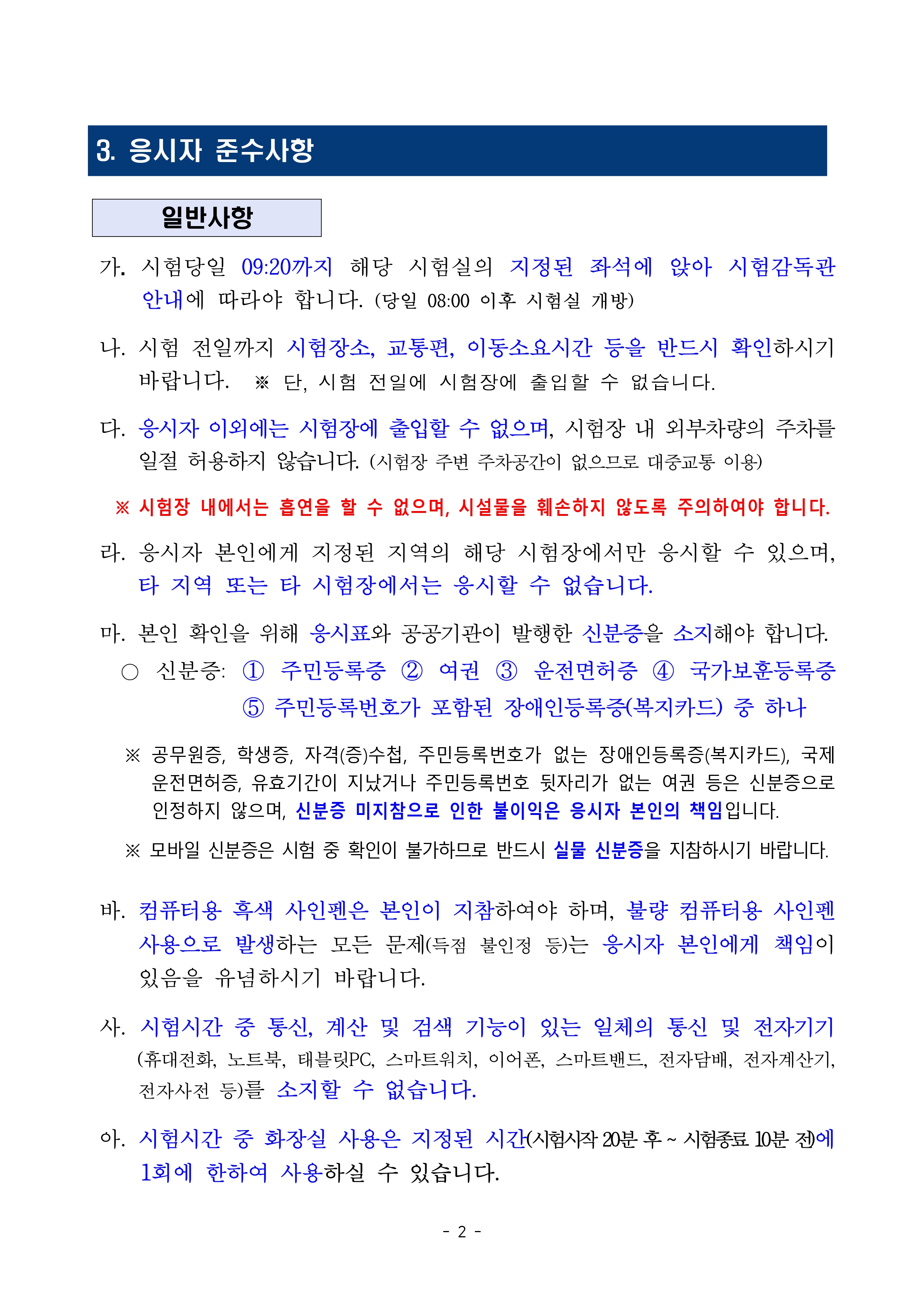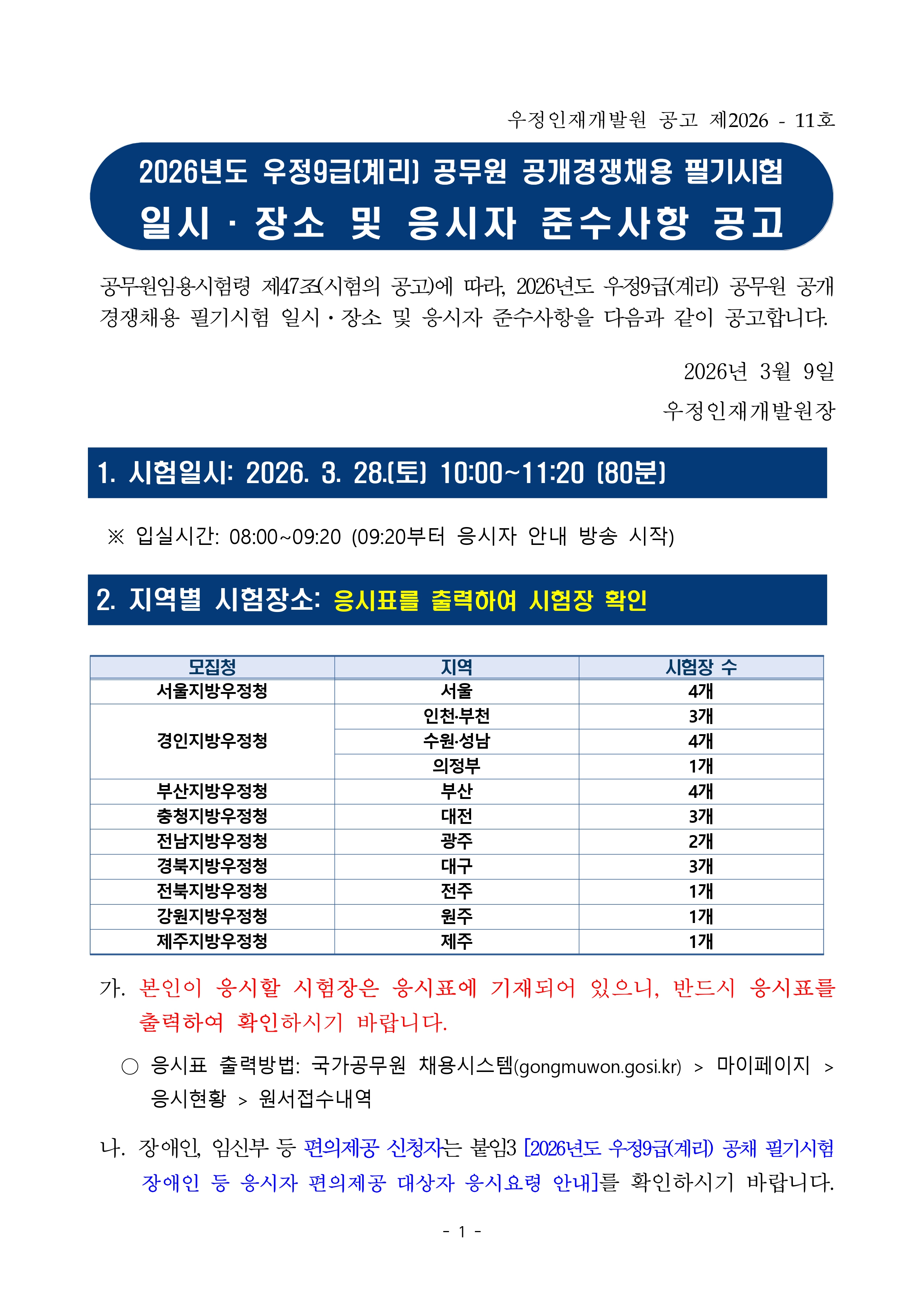 2026 계리직 필기시험 장소 및 응시자 준수사항 및 수험번호입력 안내