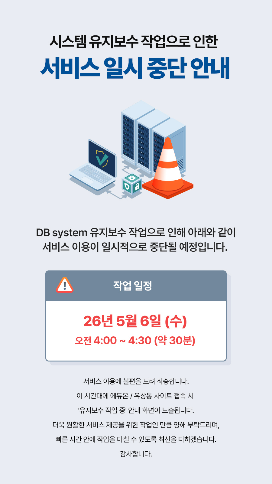 공지사항 HOME 학습지원센터 공지사항 공지사항 시스템 유지보수 작업으로 인한 서비스 일시 중단 안내 - 26.5.6(수) DATE 2026-04-29 NAME 조회수 14 목록보기