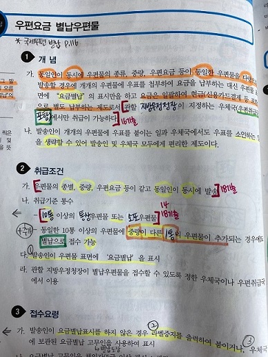 별도로 연습장 한장 뜯어서 정리한 후, 해당 페이지에 끼워두었습니다. (많지는 않고 5개정도 이런식으로 정리했었습니다~) 개인적으로 컴일은 고득점이 가장 욕심났었고. 정말로 재밌게 공부했던 과목이었습니다! 그래서 정말 자신있고. 기대되는 과목이었는데 한국사와 우금에서 시간초과를 많이 한 덕분에? 심장 쫄려가며 문제를 풀어서인지 만족스러운 점수를 받지 못했고ㅠ 비록 저조한 점수이지만 유수쌤 덕분에 어려운 과목을 쉽고 재미있게 공부할 수 있었습니다!!! 그래도 시간에 쫄려 흐리멍텅해진 정신에서 합격권 점수가 나왔다는 것만으로도 만족하자!고 생각했습니다 ㅎㅎ 4-2. 우편과 금융상식 [우금:-2개, 영어:-2개] : 오직 고민석쌤 선이해-철저한암기, 고통 우금은 선이해 후, 철저한 암기에 집중했습니다. 많은 분들이 우금 회독 수에 집착하는 경우가 많은 것 같은데, 저는 회독은 많은 암기를 위해 뒤따라오는 것이지, 단순히 회독을 많이 하는 것보다는 정말 철저한 암기를 위해 얼마나 고통을 감수하는지를 보는 과목같습니다 ㅠㅠ Step1. 강의 듣기 + 이해 고민석쌤 강의진도에 맞추어 일단 진도를 쭉 나갔습니다. 사실 뭐가 뭔지도 모르겠고. 이걸 어떻게 다 외우지? 라는 무서움이 정말 가득하지만 암기도 이해를 해야 조금이나마 편하게 암기할 수 있으므로 강의를 한번 듣고나서는 열심히 읽으면서 하나하나 이해하려고 많이 노력했었습니다. 특히 예금에서 펀드상품이나, 어음, 세금 등등 은 유튜브를 많이 활용했습니다. 고쌤 강의도 물론 다 들었지만, 우본에서 제시해 준 자료로만 강의를 하실 수 밖에 없고 해당 자료는 빈약하면서도 많은 내용을 담고 있는지라 온전히 이해하는데 어려움이 많았기에 경제채널을 운영하는 유튜버 분들의 도움을 많이 받았었습니다! Step2. 일단 암기 강의를 듣고 복습하면서 어느정도 이해가 됐다 싶으면 본격암기에 돌입했습니다. 혼자서 별별 암기팁 만들어가면서 외우고 또 외웠습니다. Step3. 예상문제집 풀기 고쌤 예상문제집을 풀면서 암기가 많이 늘었습니다! 내가 제대로 암기했는지 확인하는 방법은 문제를 풀면서 출력이 잘 되는지를 보는 것입니다. 책을 통째로 외우는 것은 불가능하기 때문에, 적어도 고쌤 문제집에서 나온 것들은 확실하게 외우자!는 각오로 모든 문제 보기1~4번까지 모두 ox판별하고. X인 것을 옳은 답으로 고치는 과정을 총 3번했었고 내가 명확하게 외운것 / 못외운것을 서로 다른색 형광펜을 이용해서 기본서 교재에 체크하면서 못외운 부분을 계속해서 채워나갔습니다. 예상문제집 교재를 모두 PDF로 올려주신 덕분에 아이패드를 이용해서 진짜 편하게 공부할 수 있었습니다ㅠ 감사합니다 :)